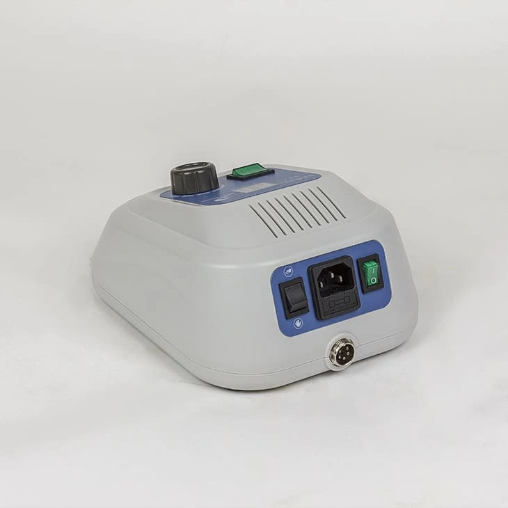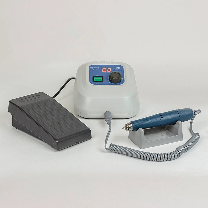 Аппарат для маникюра представляет собой блок питания с присоединенной ручкой с микродвигателем. Ножная педаль предназначена для включения и выключения маникюрного оборудования в случае, когда руки мастера заняты. Дисплей отображает количество оборотов. Скорость вращения и реверс регулируются на блоке. Для ручки аппарата предусмотрена практичная подставка.