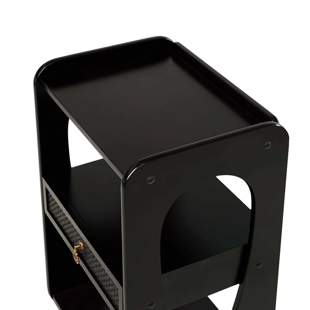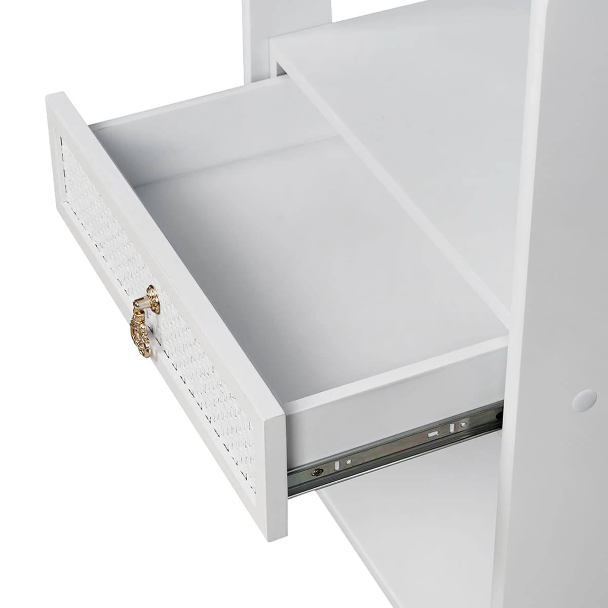 Конструкция столика не сложная, но продуманная и функциональная. Три открытые полки расположены на разных уровнях, где мастер может удобно расположить все необходимое оборудование при проведении косметологических или СПА-процедур. По центру находится небольшой выдвижной ящик с красивой декоративной накладкой и изящной ручкой. В ящике можно хранить расходные материалы и аксессуары, которые не хочется оставлять на виду. Благодаря тому, что высота ящика небольшая, расстояние между полками значительно увеличивается, и на них можно разместить высокие средства для СПА-процедур, или небольшую косметологическую технику. Самая верхняя полка оснащена бортиками с трех сторон, которые защищают от падения расположенные на ней инструменты.