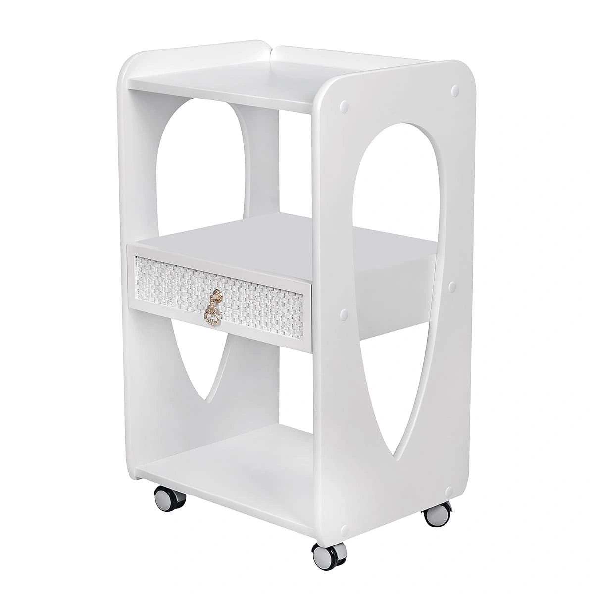 Комплектация: 1 выдвижной ящик с декорированной накладкой и 3 открытые полки; верхняя полка с бортиками; материал – дерево; 2 цвета; 4 опорных колеса, двойные, съемные.