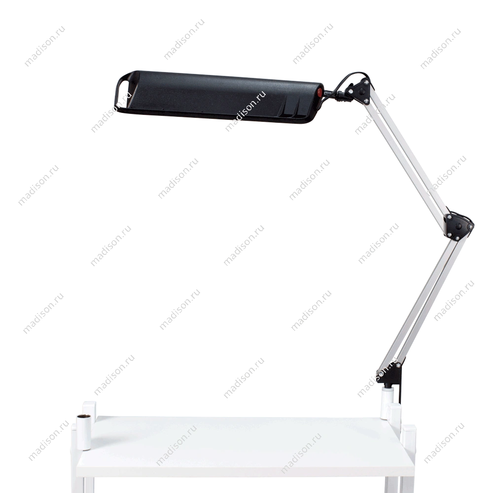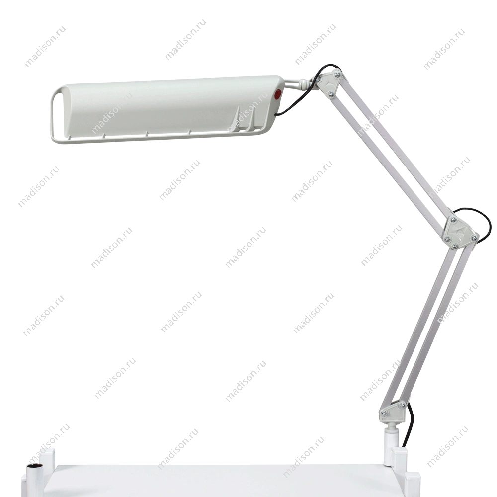 Настольная лампа крепится к поверхности с помощью струбцины черного цвета. При этом толщина стола не должна превышать 25 мм. Оборудование имеет компактные размеры и не занимает пространства рабочей зоны стола. Сменная люминесцентная лампа имеет длительный срок службы и дает качественный рассеянный свет. Она не напрягает зрение и позволяет рассмотреть даже самые мелкие детали. Работает данное устройство от бытовой сети с напряжением 220 В и имеет мощность 11 Вт. Удобная и практичная лампа маникюрная от магазина МЭДИСОН идеально подойдет для работы в кабинете и домашнего использования. Для гармоничности дизайна рабочего места в одном цветовом решении с лампой можно приобрести подставку под лаки и маникюрную подушку.