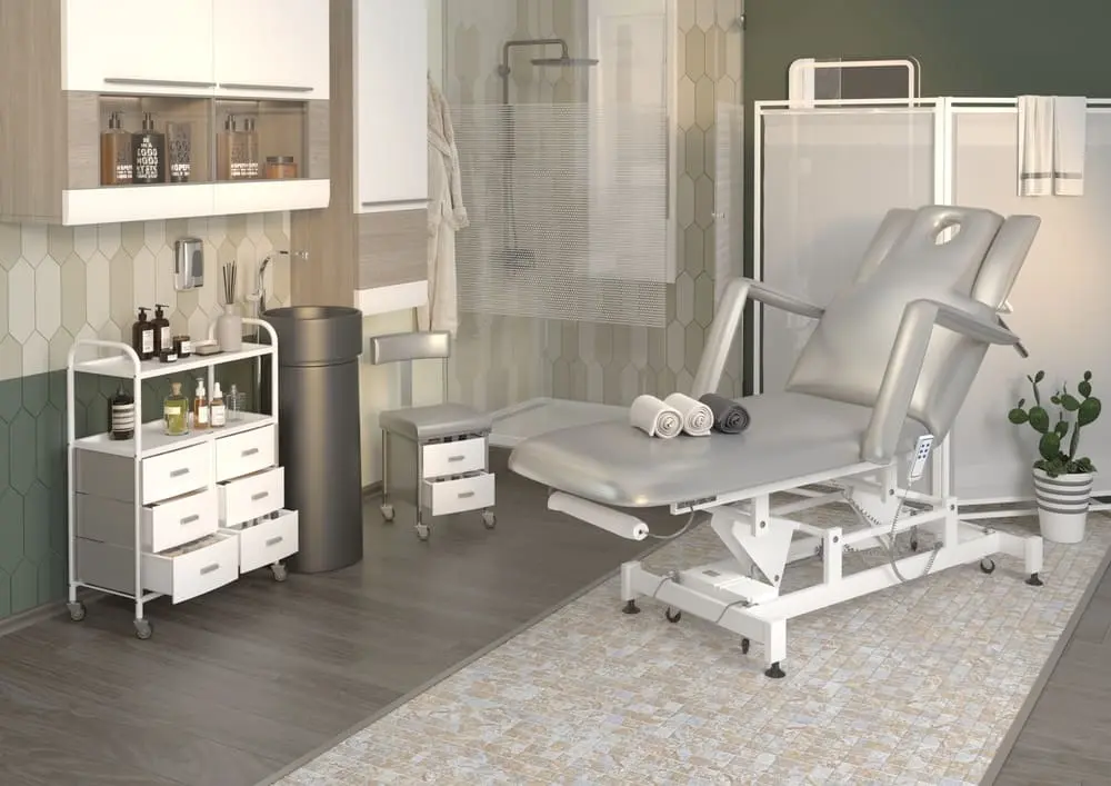 Кушетка разделена на два мягких сегмента, положение которых регулируется. С помощью двух встроенных электромоторов можно дистанционно регулировать угол наклона спинки и высоту кушетки. В комплект поставки входит удобный пульт управления электроприводом. Каркас и основание из металла с защитным покрытием.
