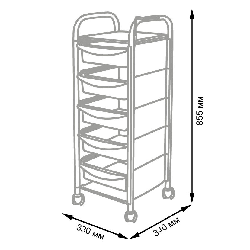 Комплектация: основа из металла на манёвренных колесиках, боковые пластиковые панели, выдвижные ящики (5 штук), верхняя полка.