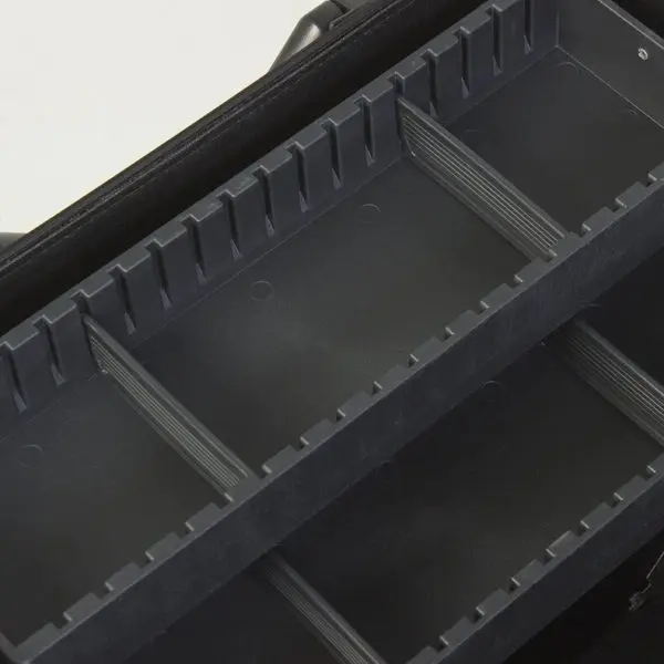 Внутренние полки представлены ярусами для удобного доступа к инструментам. В нижней части кейса предусмотрено пространство для приспособлений больших размеров. При необходимости можно воспользоваться ремнем для переноски, который фиксируется надежными карабинами. Застежки на корпусе не позволяют кейсу раскрыться в самый неподходящий момент.