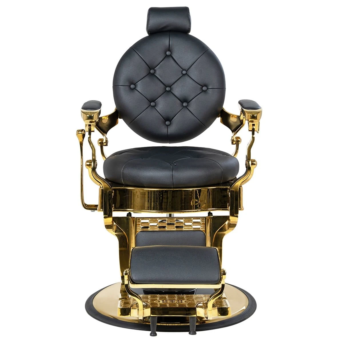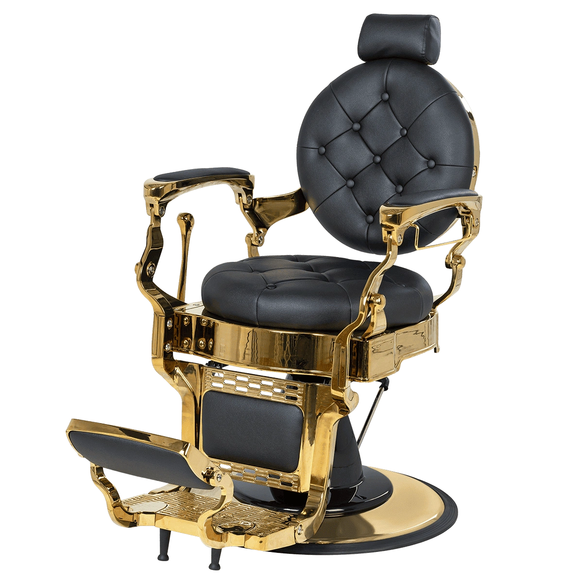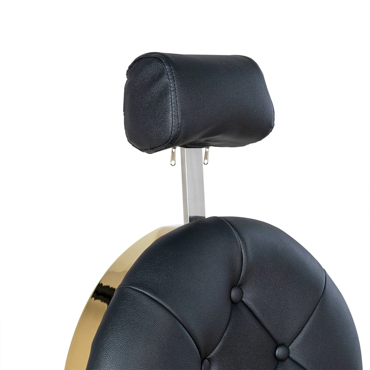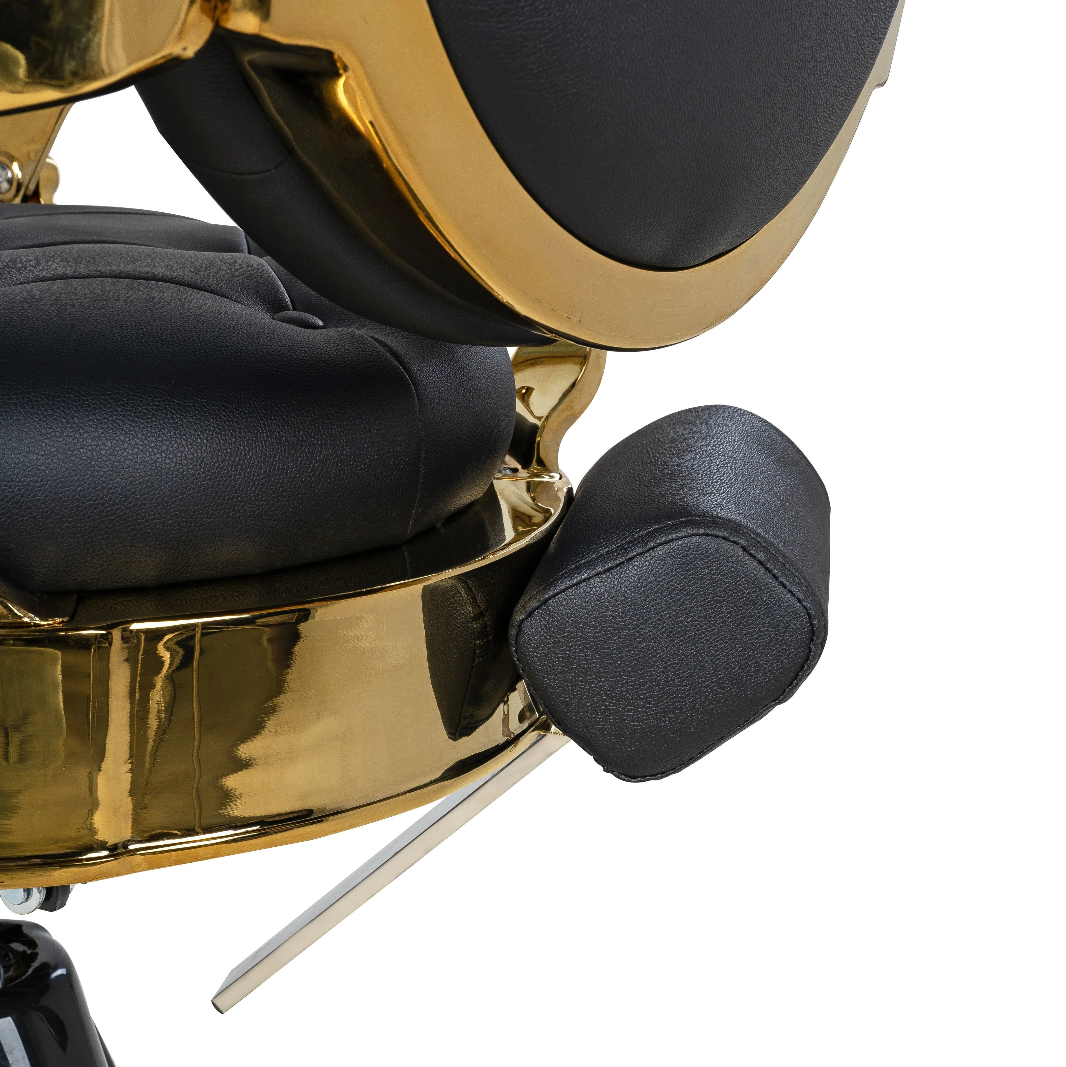Круглые сиденье и спинка, декоративные металлические детали и фурнитура, полированный каркас в золотом цвете выделяют эту модель среди других кресел. Мягкий выдвижной подголовник поддержит голову и шею клиента. Металлическая подножка с подставкой для ног и накладкой из экокожи– ещё одно практичное дополнение. Она предупредит переутомление ног в течение длительных процедур.