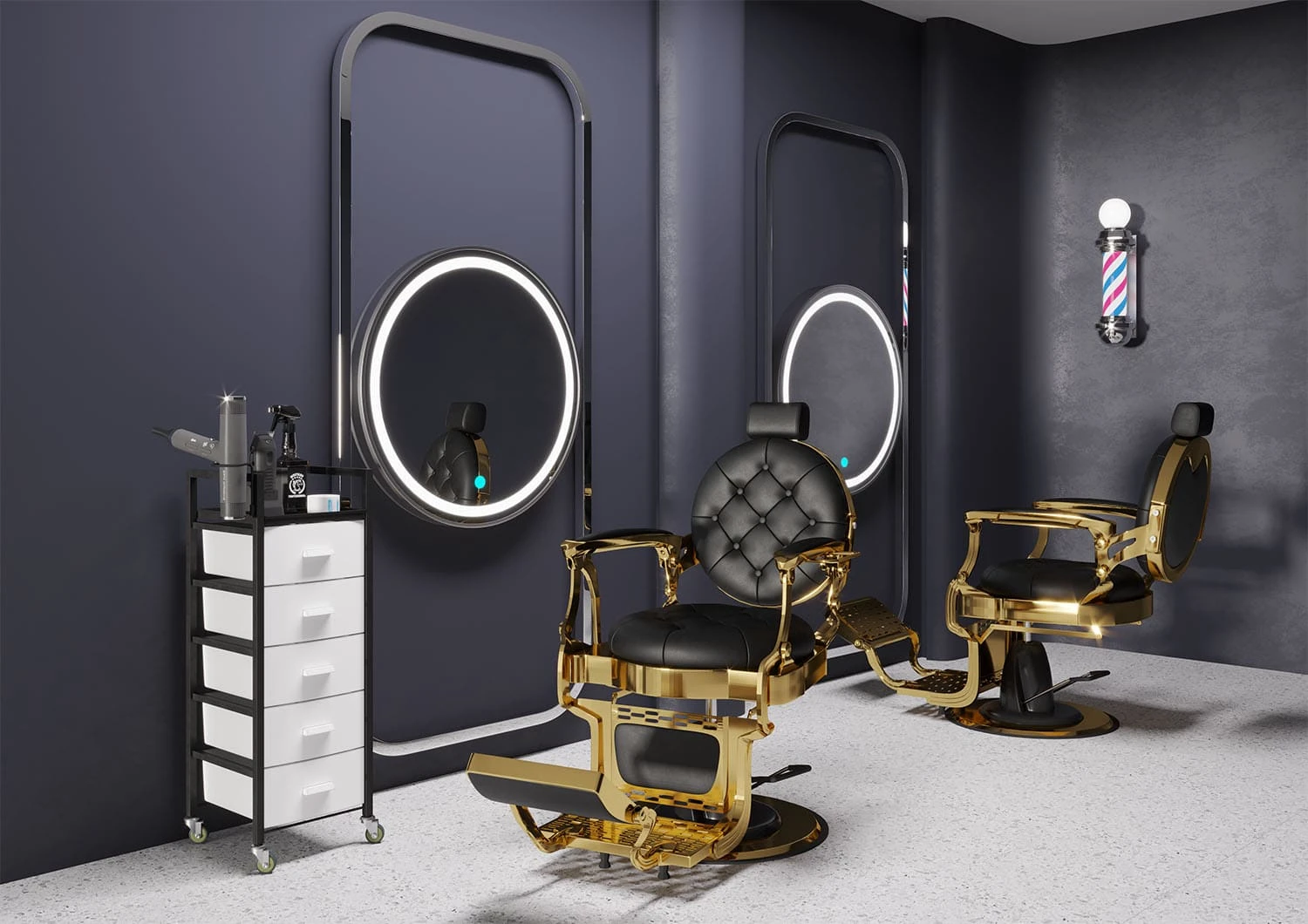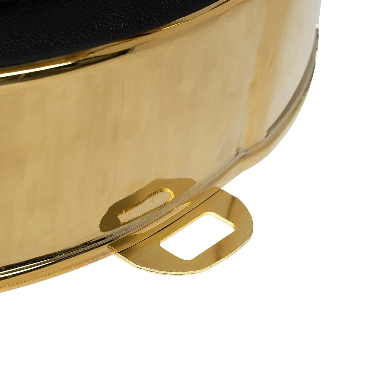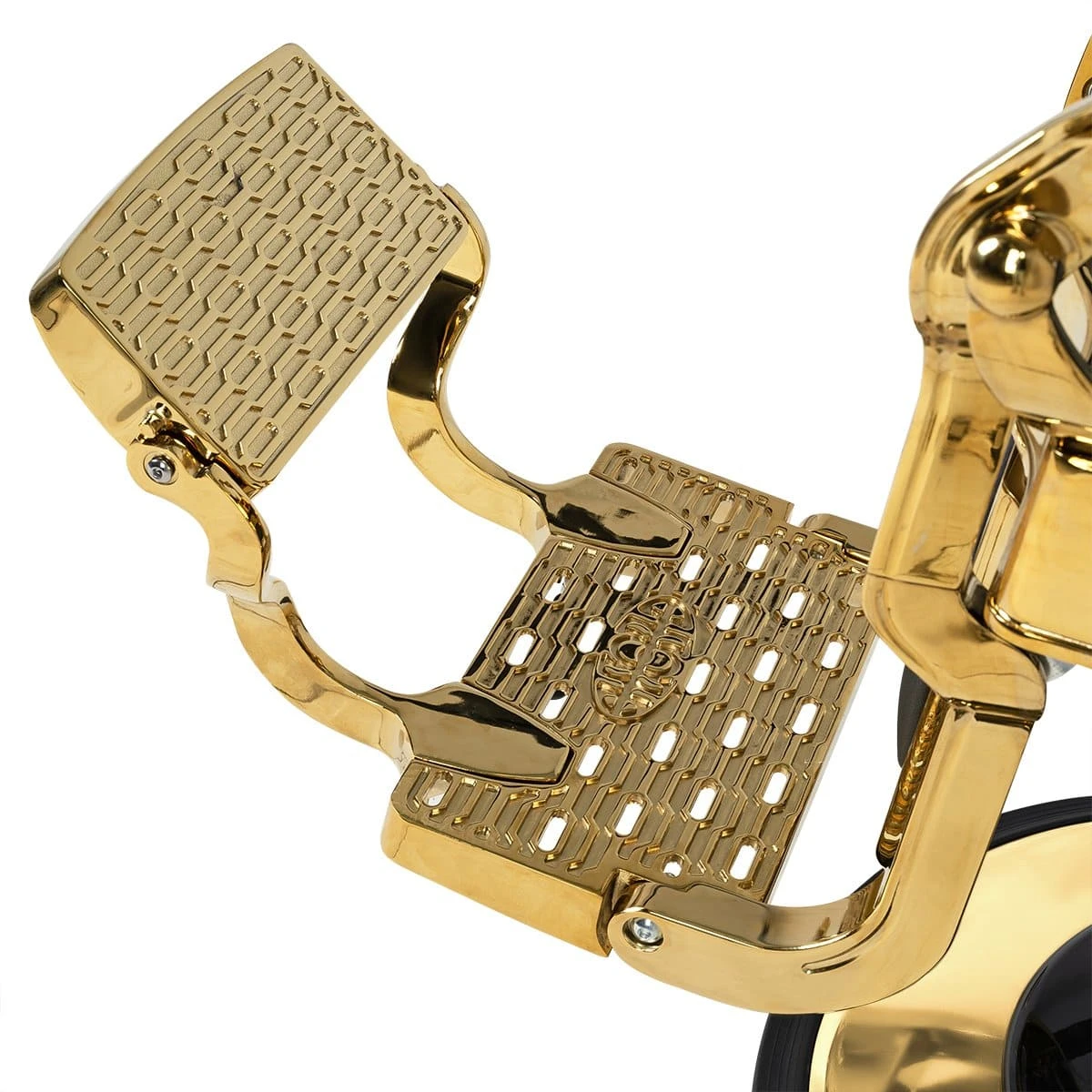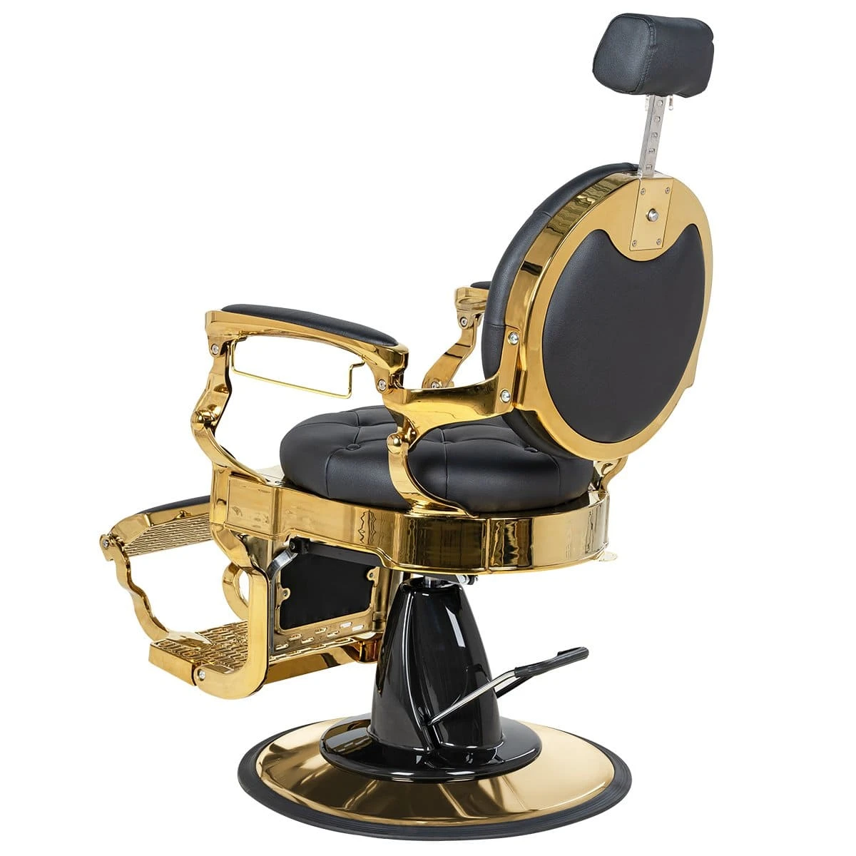 Круглые сиденье и спинка, декоративные металлические детали и фурнитура, полированный каркас в золотом цвете выделяют эту модель среди других кресел. Мягкий выдвижной подголовник поддержит голову и шею клиента. Металлическая подножка с подставкой для ног и накладкой из экокожи– ещё одно практичное дополнение. Она предупредит переутомление ног в течение длительных процедур.