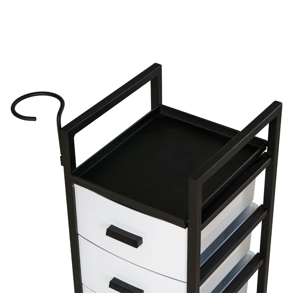 Для принадлежностей в парикмахерской тележке есть пять выдвижных ящиков. Верхняя полка позволит мастеру держать под рукой инструменты, необходимые во время работы с клиентом. На боковине установлен практичный фенодержатель. Вращающиеся колесики обеспечивают плавное и практически бесшумное перемещение оборудования в пределах рабочей зоны.