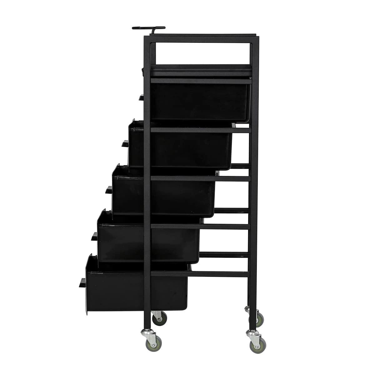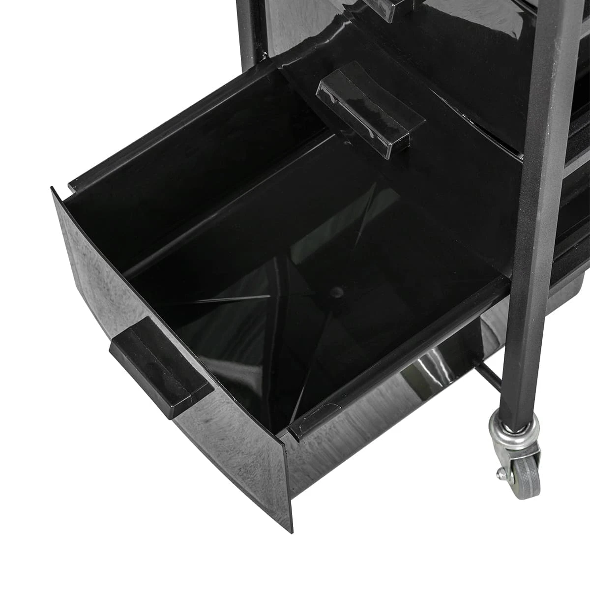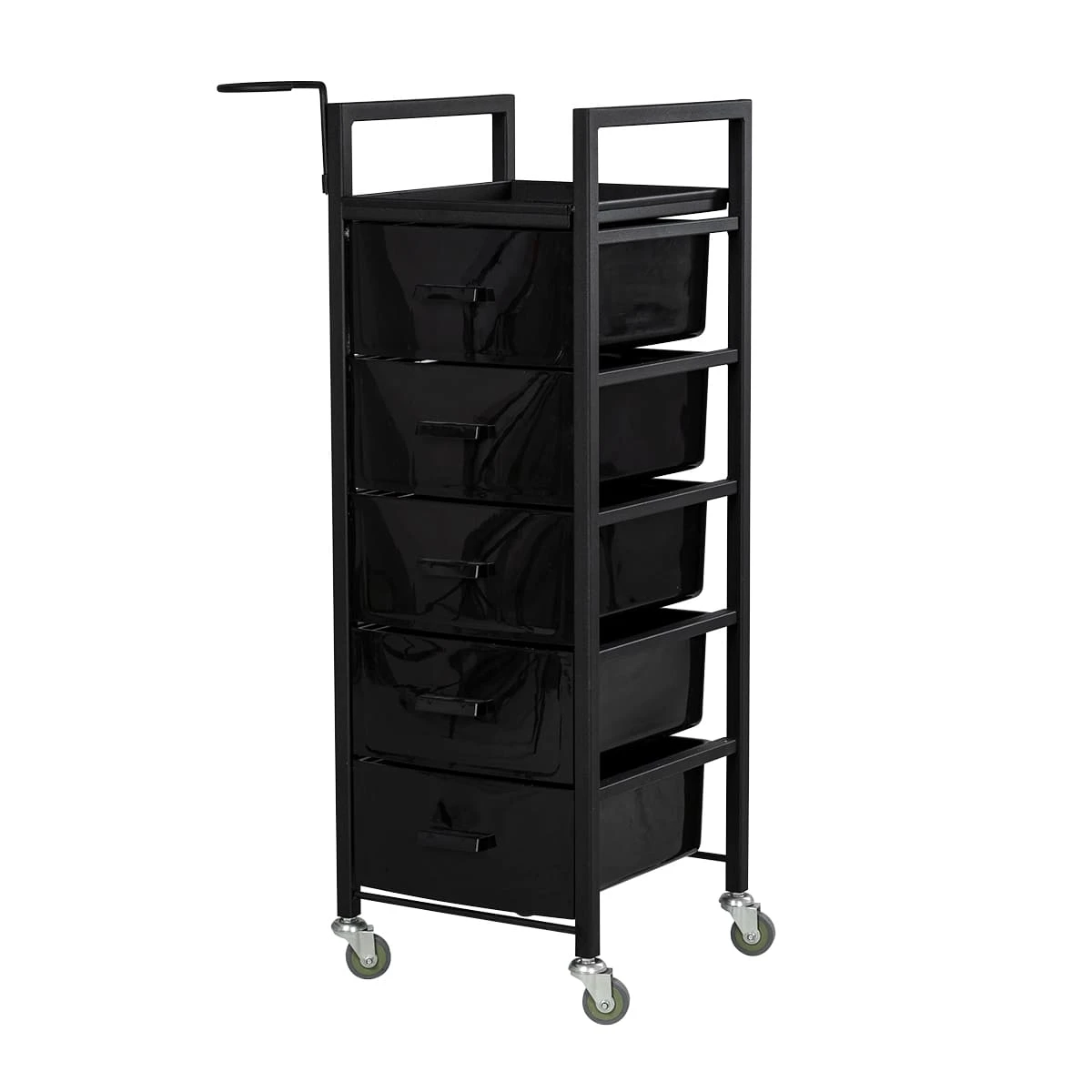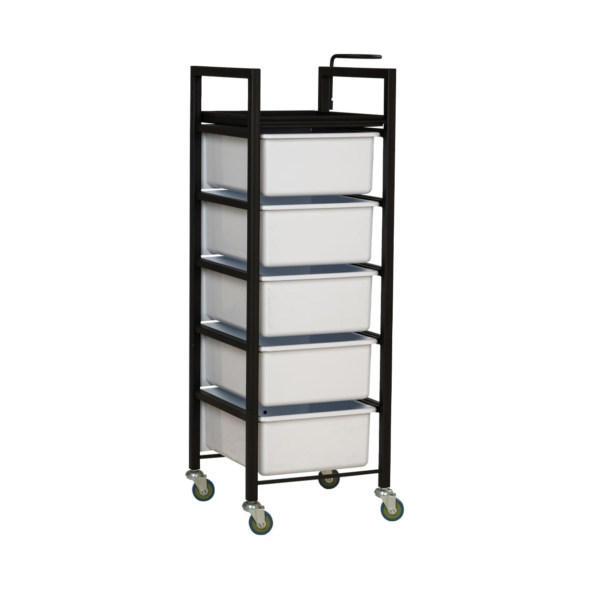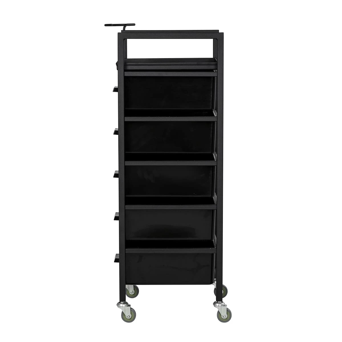 Для принадлежностей в парикмахерской тележке есть пять выдвижных ящиков. Верхняя полка позволит мастеру держать под рукой инструменты, необходимые во время работы с клиентом. На боковине установлен практичный фенодержатель. Вращающиеся колесики обеспечивают плавное и практически бесшумное перемещение оборудования в пределах рабочей зоны.