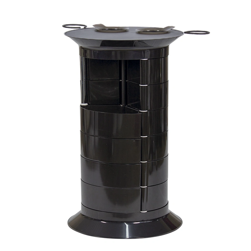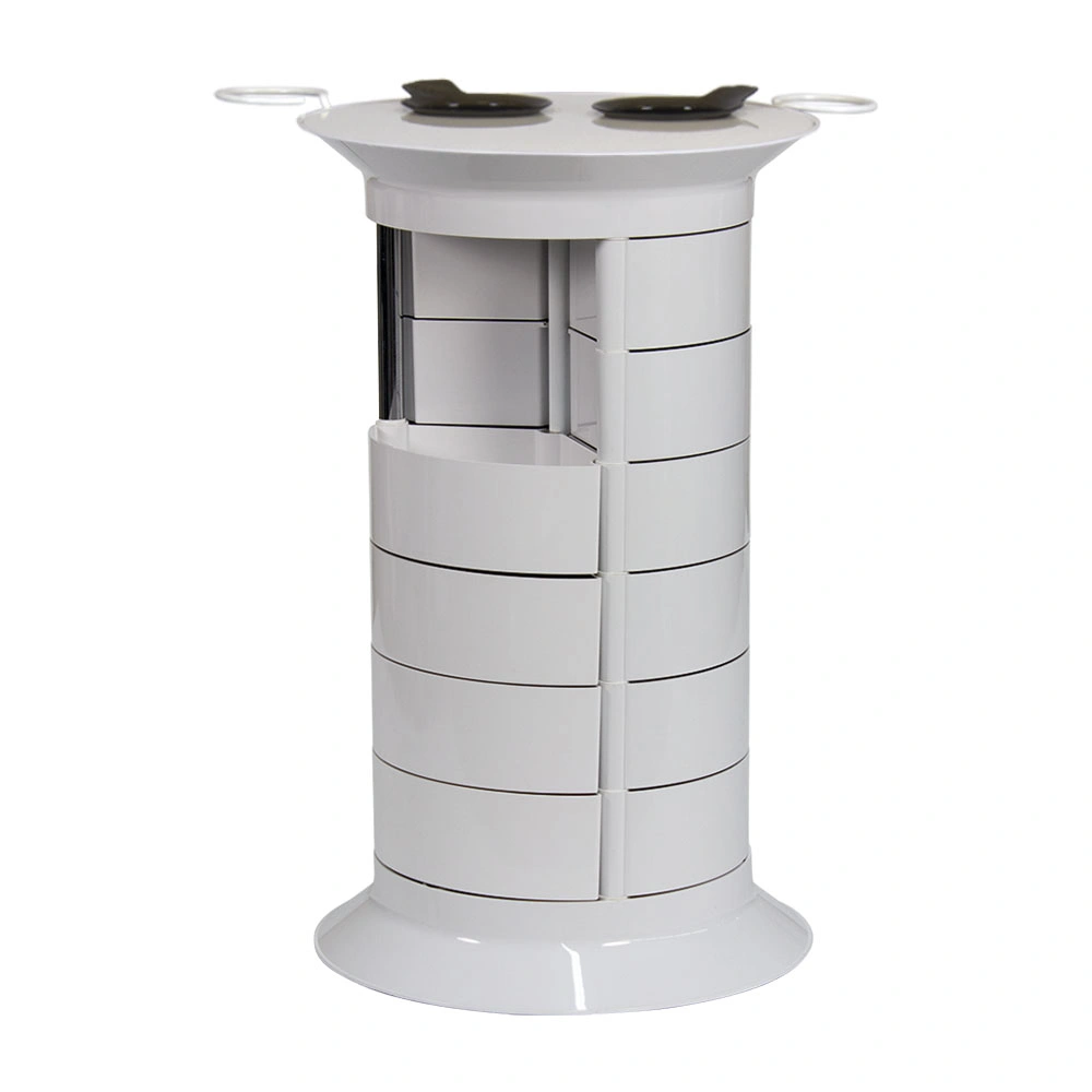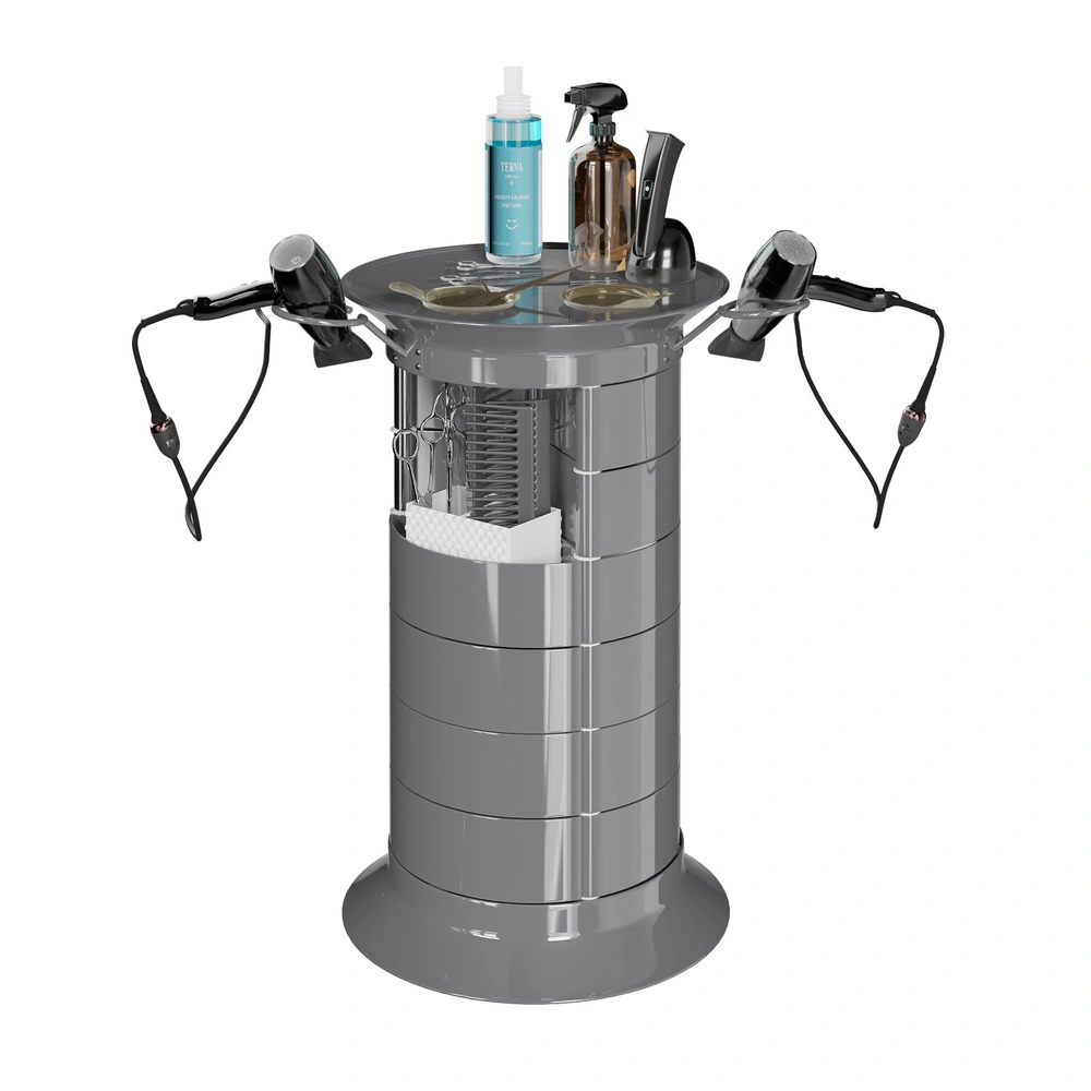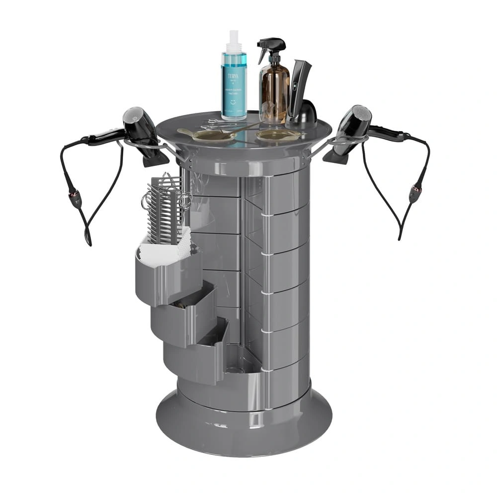 Продуманная конструкция позволит мастеру хранить все свои приспособления в одном месте. В распоряжении специалиста 16 раздвижных ящичков, которые поворачиваются вокруг стоек каркаса. Чтобы в тумбе можно было поставить высокие сосуды, с одной стороны отсутствует два ящика. Верхняя полка имеет специальные отверстия, предназначенные для емкостей и чаш. С двух сторон крышка оборудована держателями для фенов. Мобильность мебели обеспечивается шестью поворотными колесиками. Тележка может быть использована для обстановки двух рабочих мест.