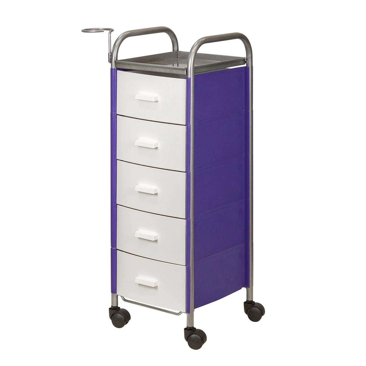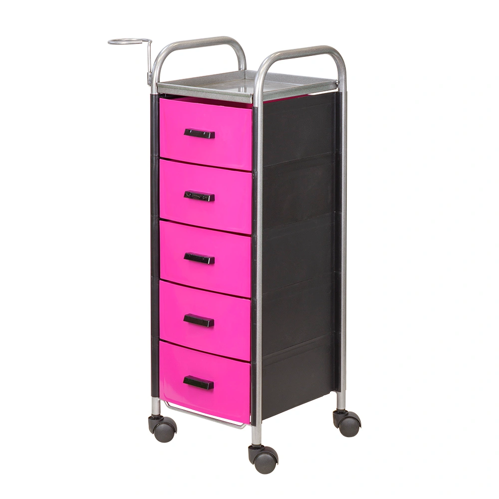 Для принадлежностей в парикмахерской тележке есть пять выдвижных ящиков. Верхняя полка позволит мастеру держать под рукой инструменты, необходимые во время работы с клиентом. На боковине установлен практичный фенодержатель. Вращающиеся колесики обеспечивают плавное и практически бесшумное перемещение оборудования в пределах рабочей зоны.