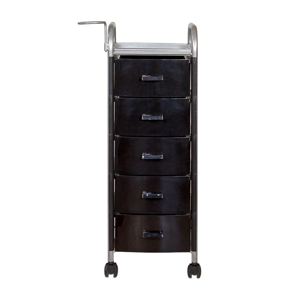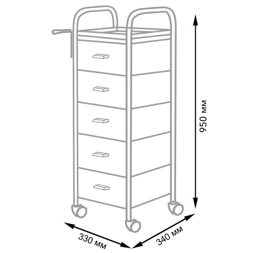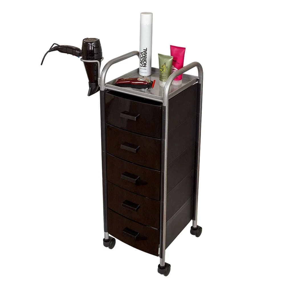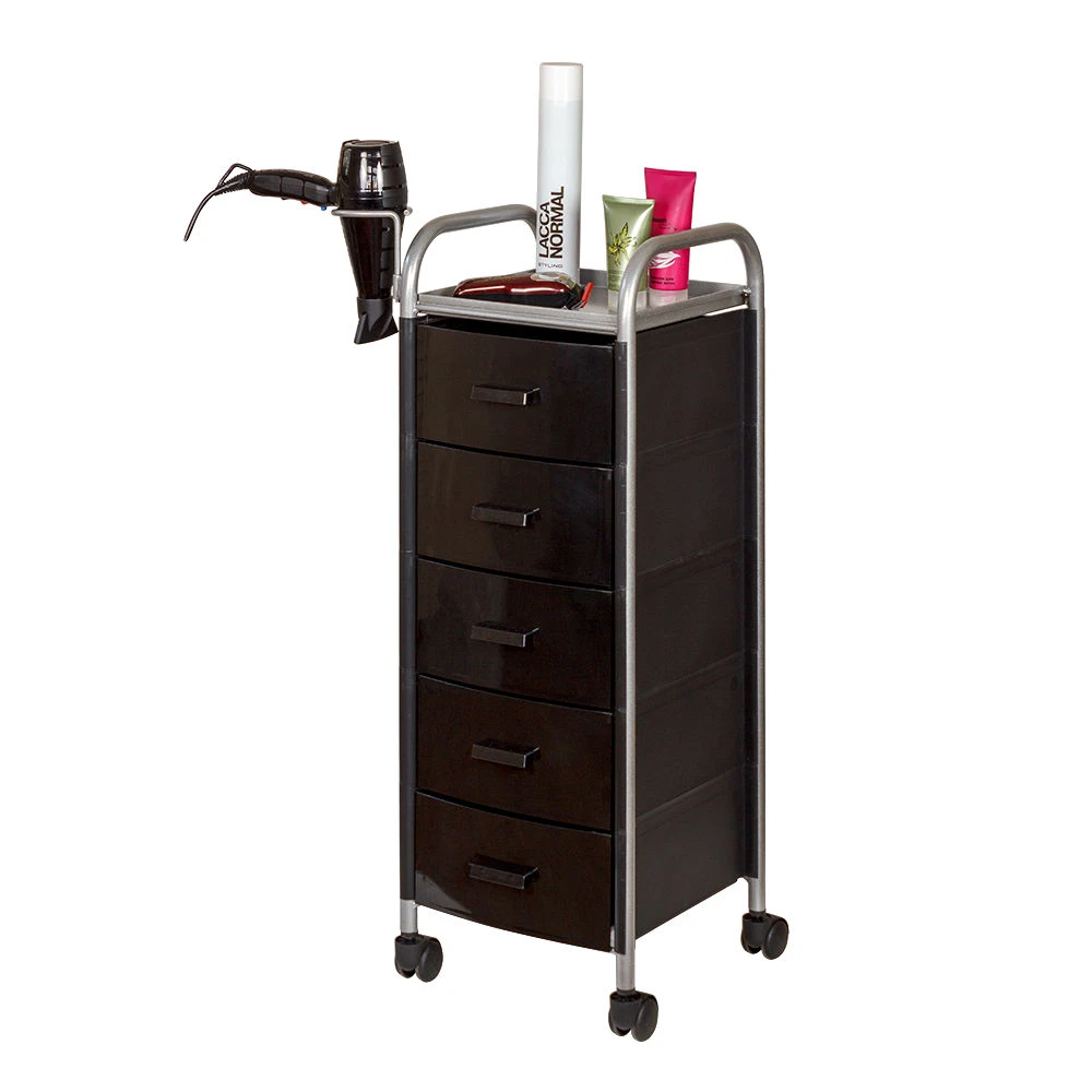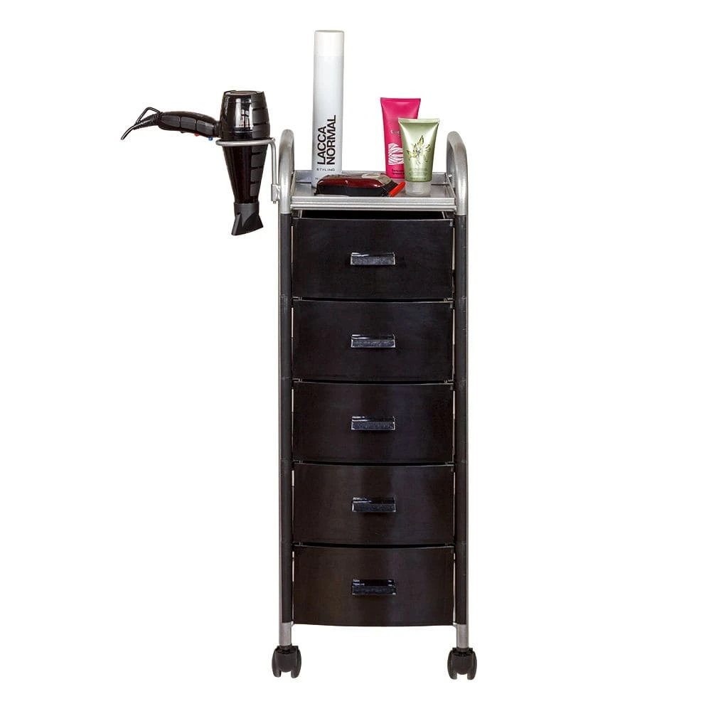 Для принадлежностей в парикмахерской тележке есть пять выдвижных ящиков. Верхняя полка позволит мастеру держать под рукой инструменты, необходимые во время работы с клиентом. На боковине установлен практичный фенодержатель. Вращающиеся колесики обеспечивают плавное и практически бесшумное перемещение оборудования в пределах рабочей зоны.