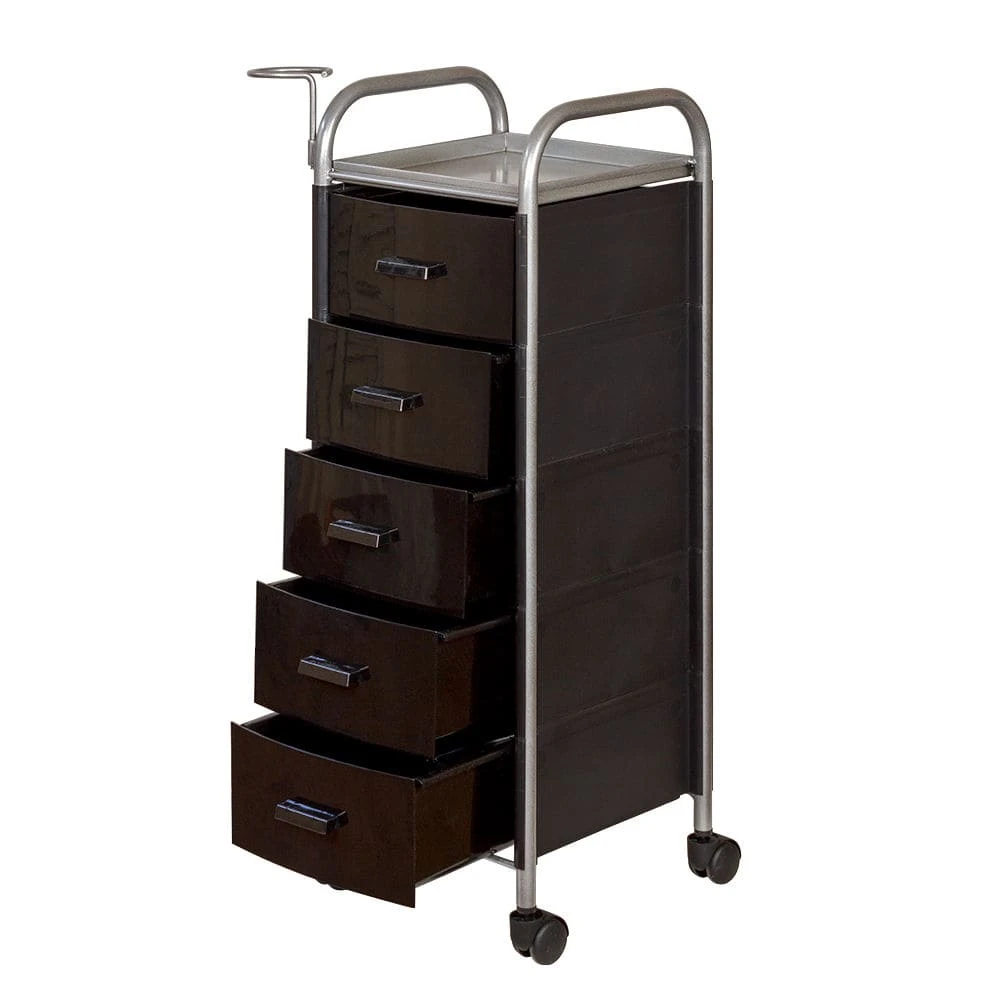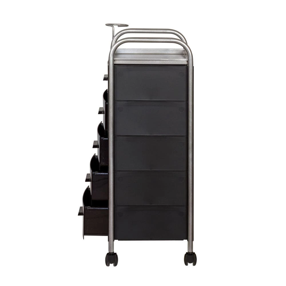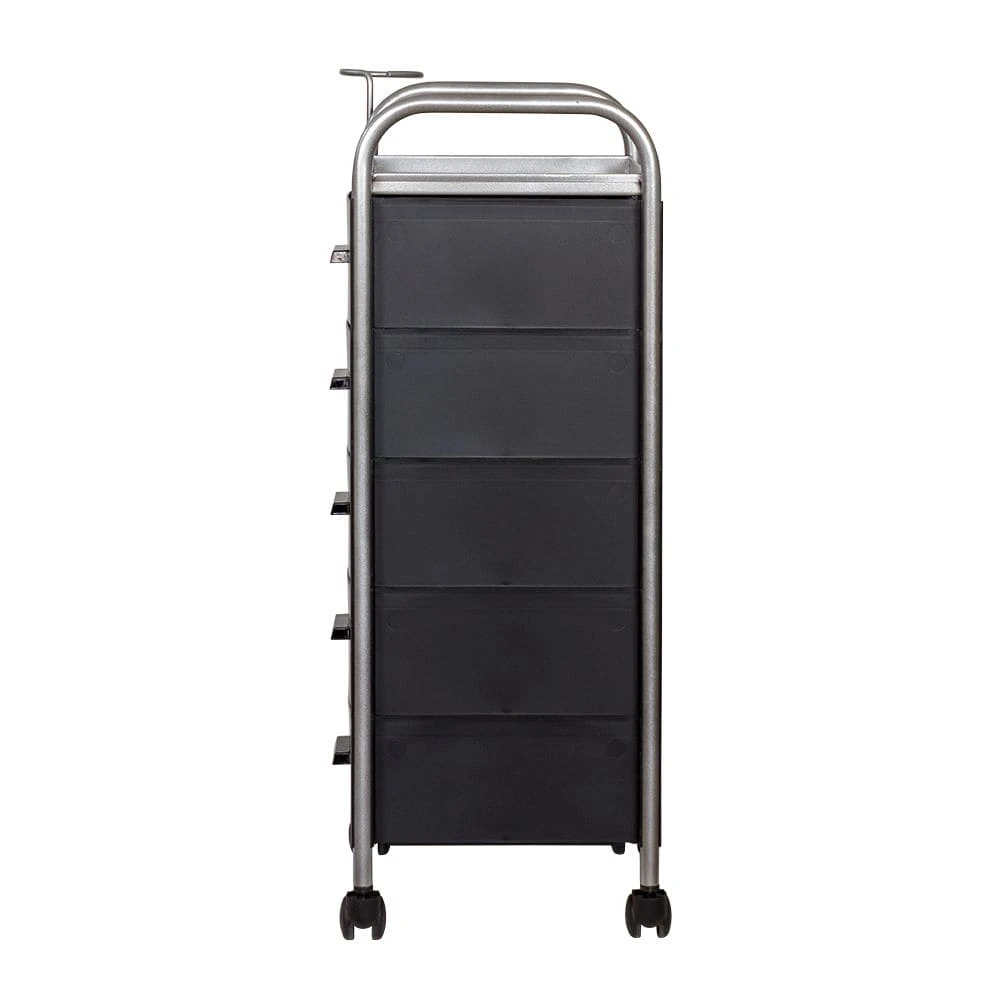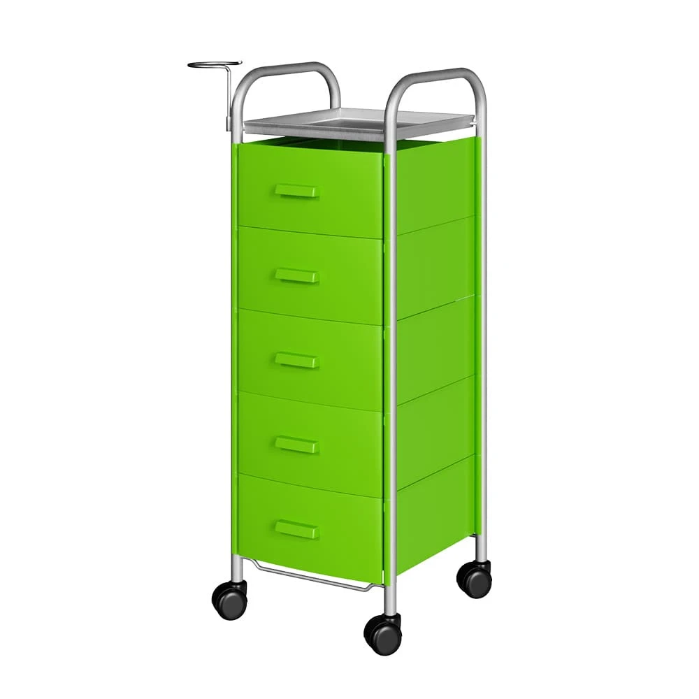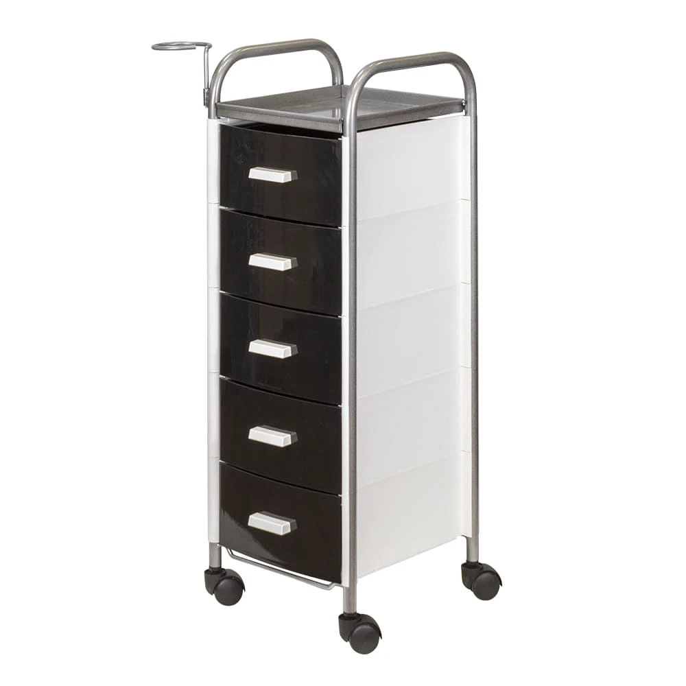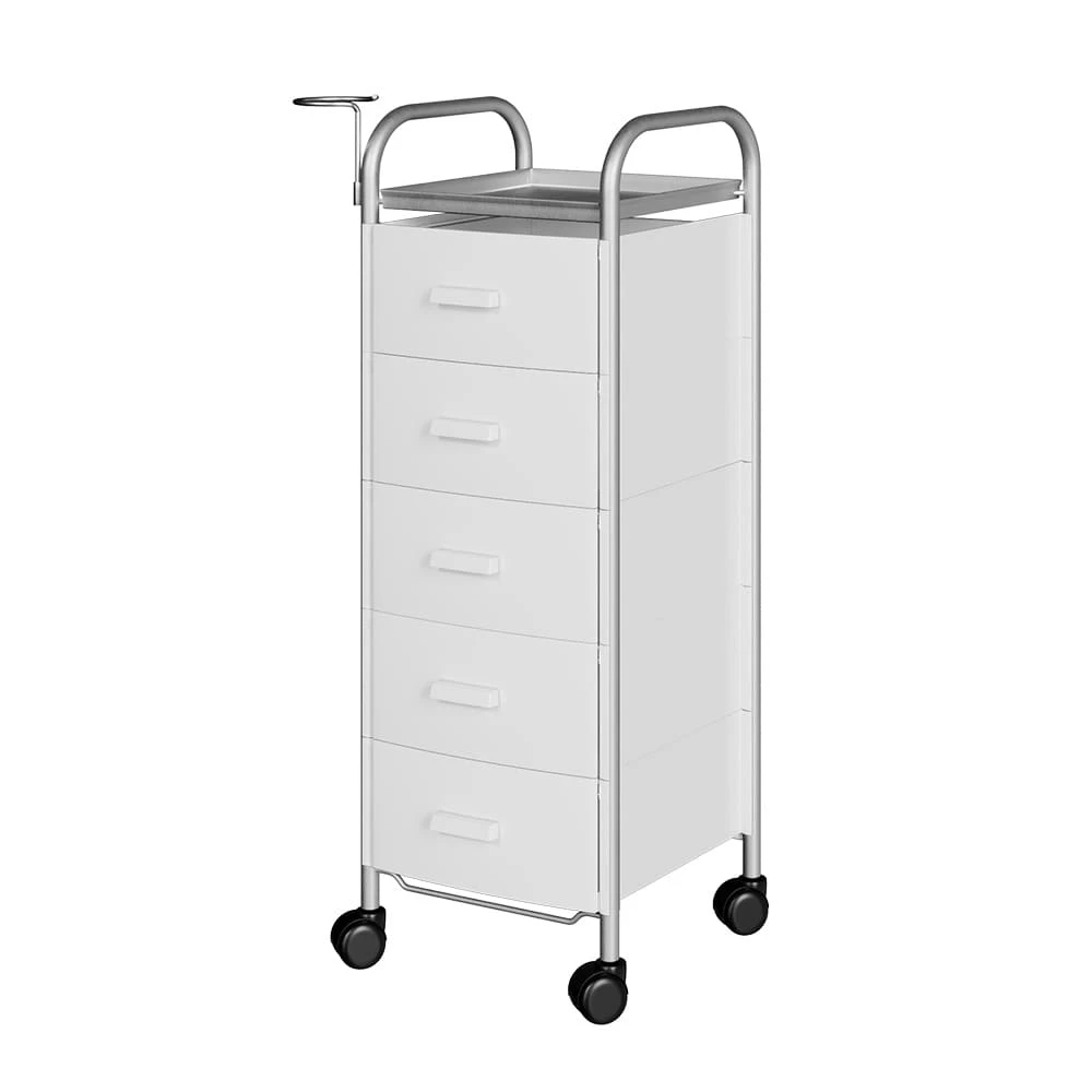 Для принадлежностей в парикмахерской тележке есть пять выдвижных ящиков. Верхняя полка позволит мастеру держать под рукой инструменты, необходимые во время работы с клиентом. На боковине установлен практичный фенодержатель. Вращающиеся колесики обеспечивают плавное и практически бесшумное перемещение оборудования в пределах рабочей зоны.