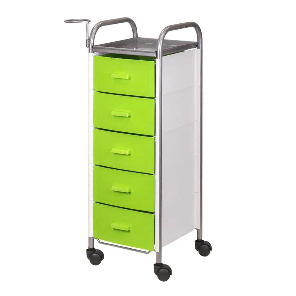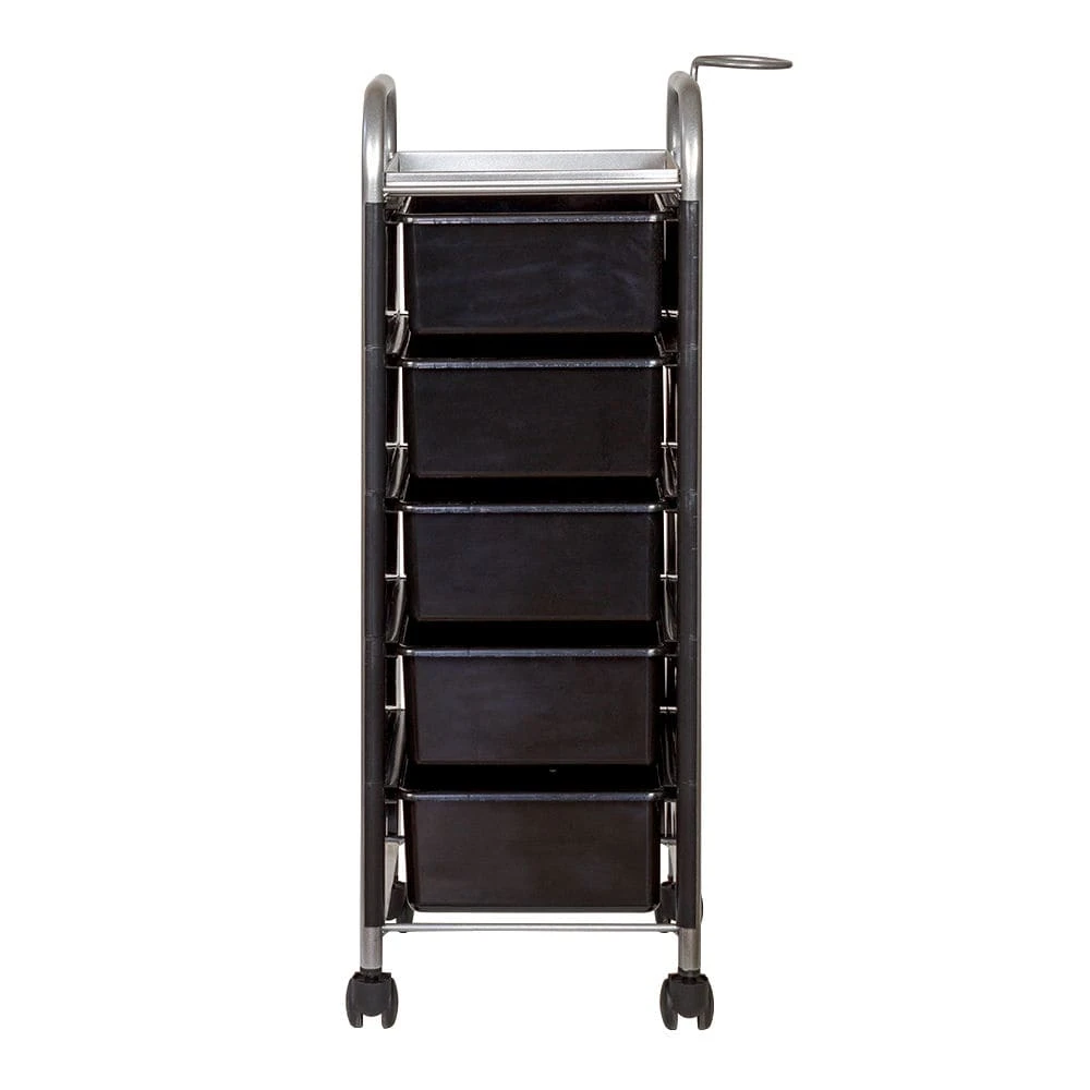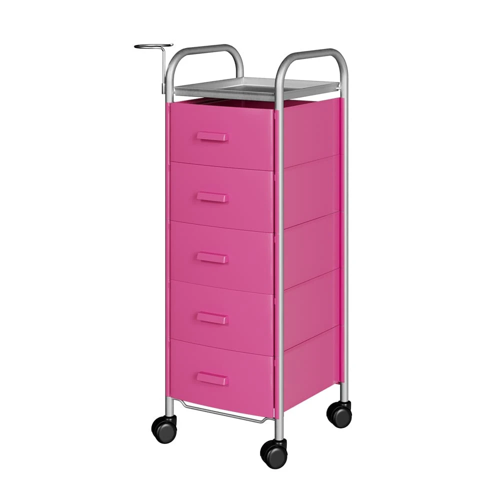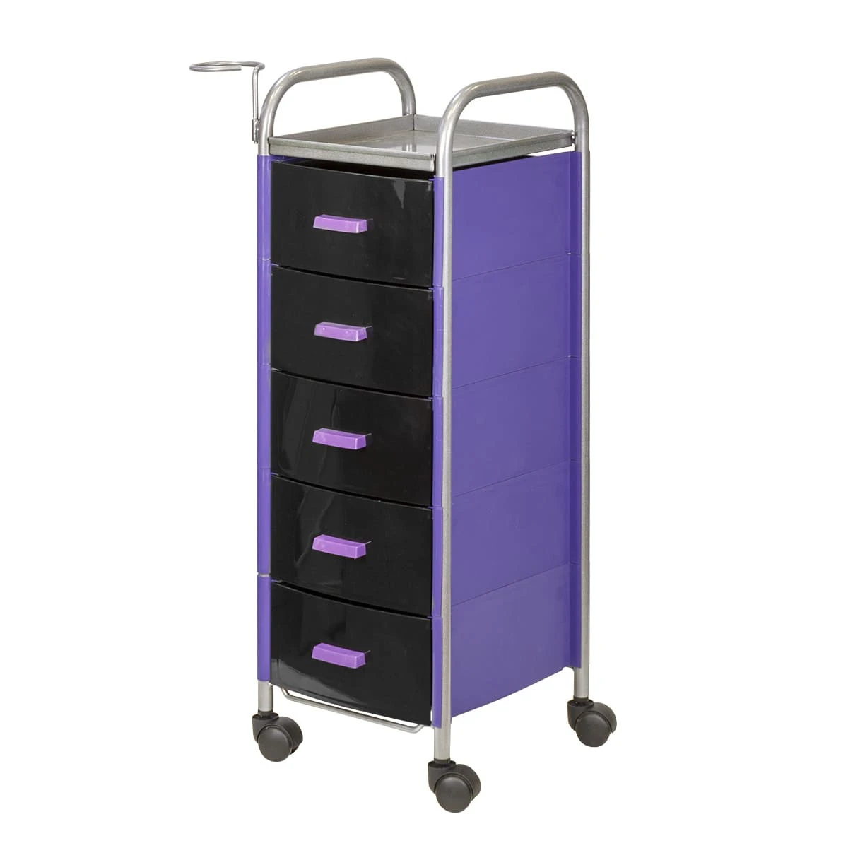 Для принадлежностей в парикмахерской тележке есть пять выдвижных ящиков. Верхняя полка позволит мастеру держать под рукой инструменты, необходимые во время работы с клиентом. На боковине установлен практичный фенодержатель. Вращающиеся колесики обеспечивают плавное и практически бесшумное перемещение оборудования в пределах рабочей зоны.