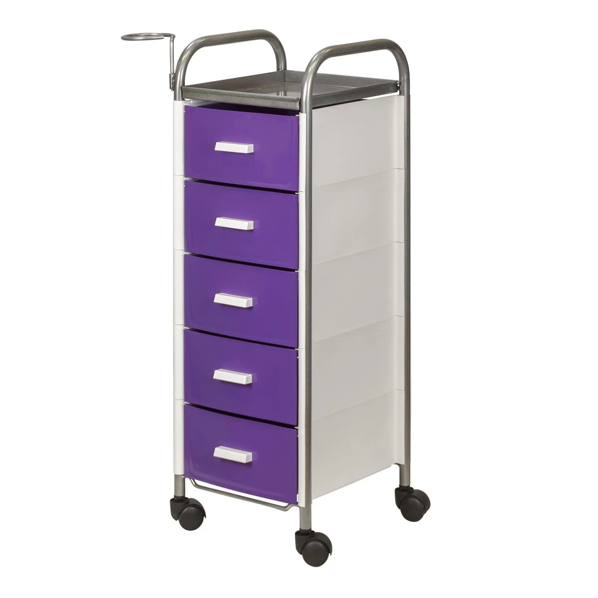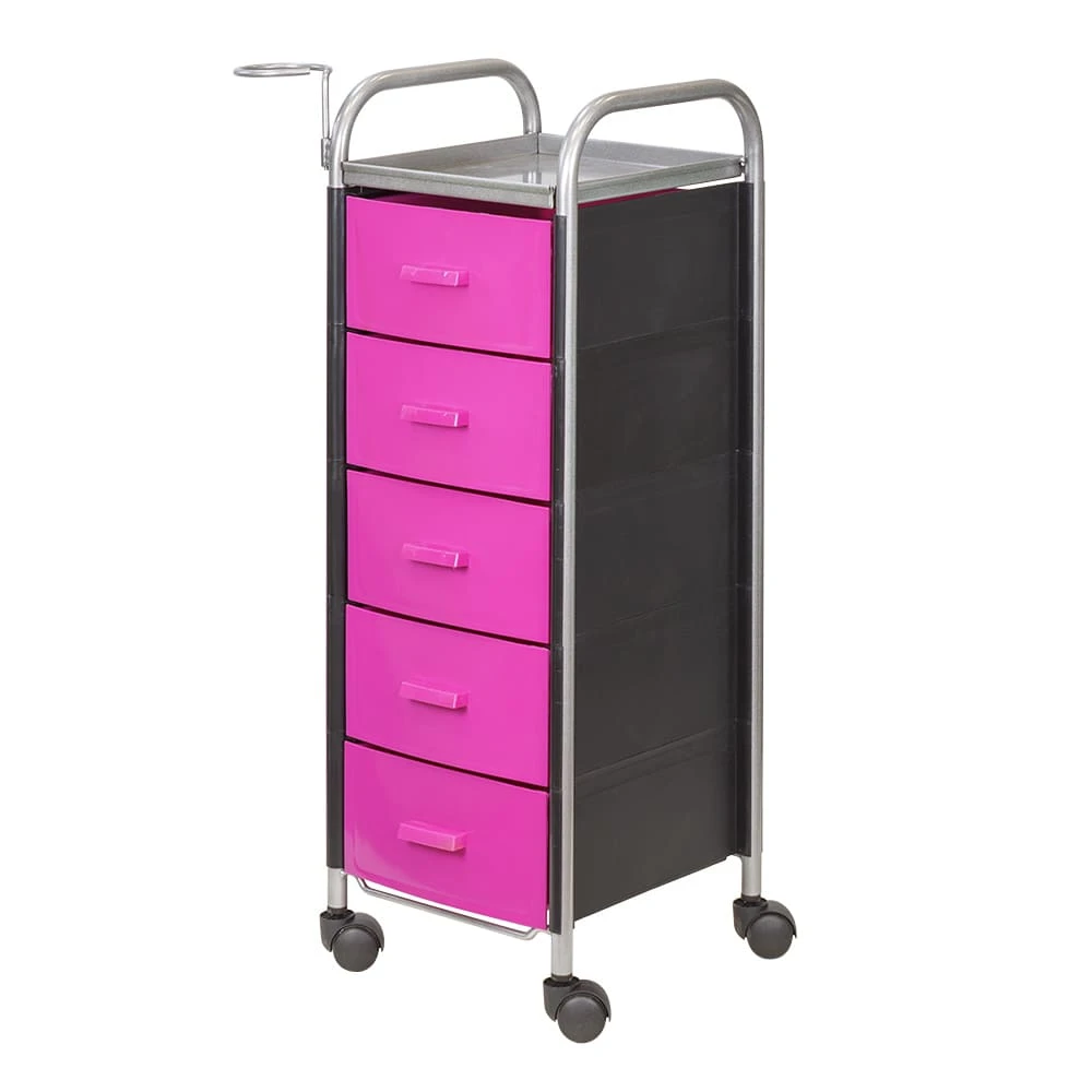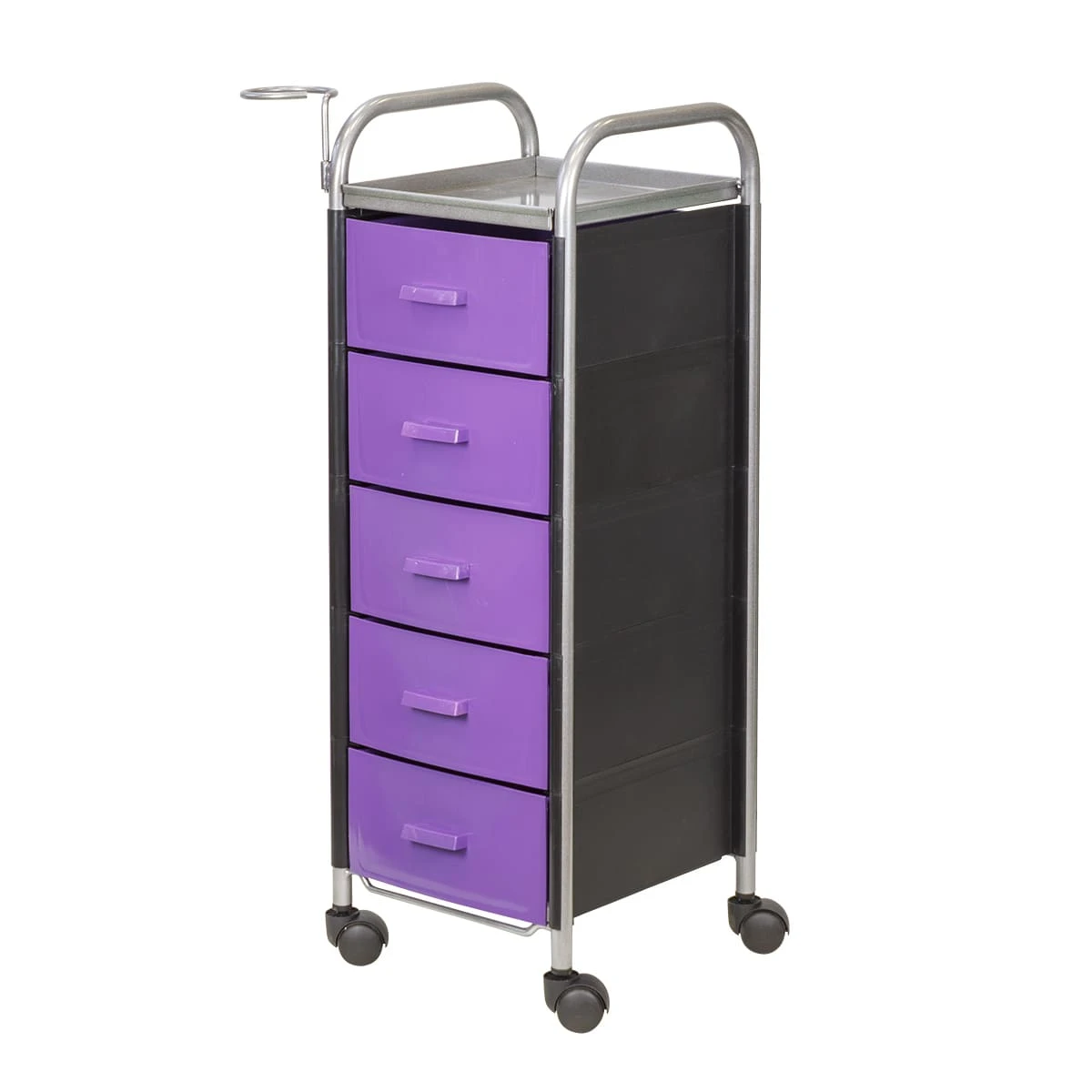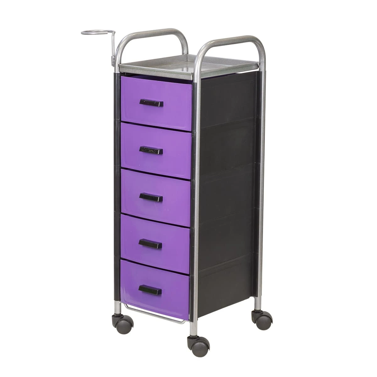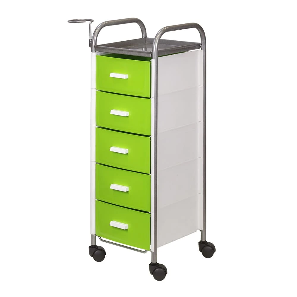 Для принадлежностей в парикмахерской тележке есть пять выдвижных ящиков. Верхняя полка позволит мастеру держать под рукой инструменты, необходимые во время работы с клиентом. На боковине установлен практичный фенодержатель. Вращающиеся колесики обеспечивают плавное и практически бесшумное перемещение оборудования в пределах рабочей зоны.