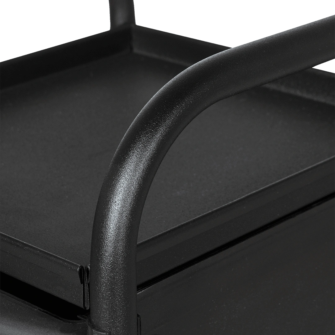 Тележка парикмахерская М-02 черного цвета пользуется особым спросом среди покупателей в нашем магазине. Она вместительна, надежна, имеет привлекательный внешний вид и универсальный цвет, благодаря чему отлично впишется в интерьер любого салона. Каркас тележки изготовлен из прочного металла. К боковинам крепятся цельные пластиковые панели с пазами для ящиков. Мобильность тележки обеспечивают надежные пластиковые колеса, конструкция которых позволяет им легко и абсолютно бесшумно вращаться на любом напольном покрытии.