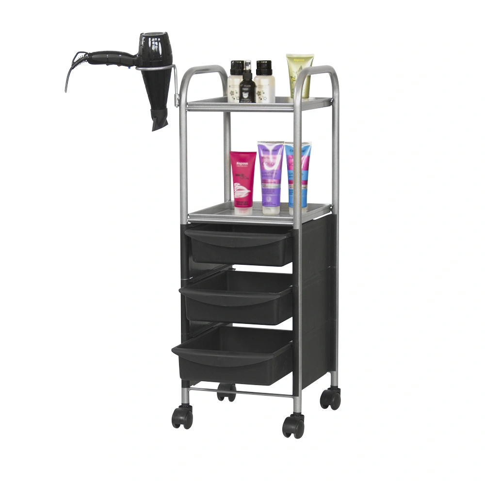 Наличие бортиков убережет инструмент от случайного падения. Практичное дополнение парикмахерской тележки – удобный держатель для фена. Оборудование можно переместить в любую точку салона благодаря манёвренным колесикам.
