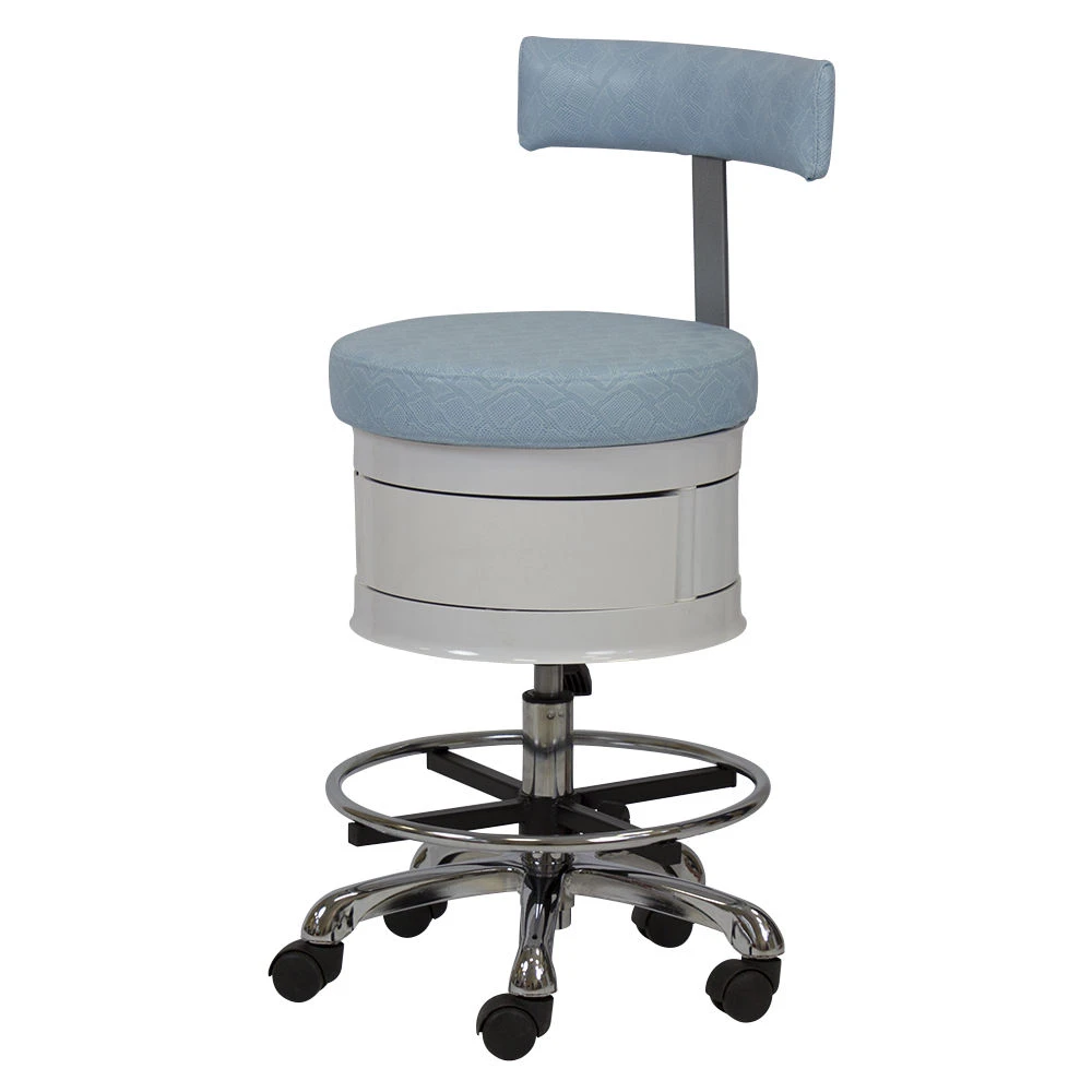 Спинка поддерживает правильную осанку и не позволит мастеру утомиться во время рабочего процесса. Дополнительная опция – круглая опора для ног. Оборудование можно с легкостью перемещать по рабочей поверхности за счет пяти вращающихся колесиков. Практичное дополнение стула – тумбочка из трех ящиков, в которых можно держать необходимые для работы инструменты. Это позволит мастеру экономить время на поисках приспособлений. Для регулировки высоты сидения в конструкции предусмотрен пневматический механизм.