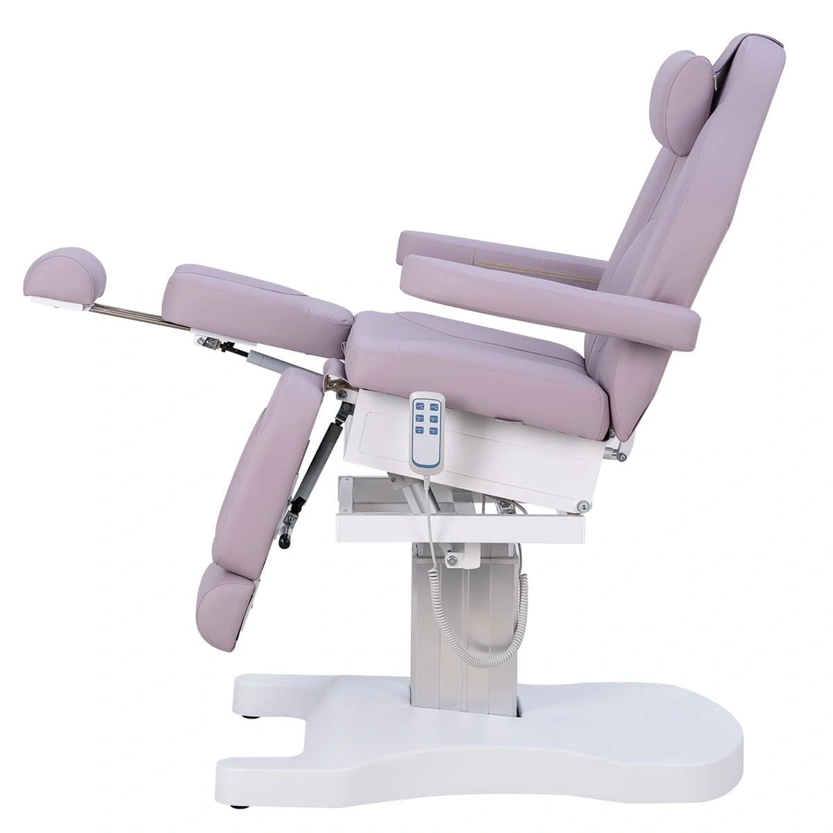 Функционал кресла Оникс-04 на колонне, 3 мотора дополняет электропривод с тремя моторами для регулирования высоты, положения спинки и наклона сиденья. Высота ножек регулируется пневматикой. Все механические детали аккуратно спрятаны в стильной серебристой колонне. Мягкие элементы под стопы легким движением выдвигаются на необходимую длину. Наличие различных регулировок позволяет мастеру подобрать наиболее удобное положение кресла.